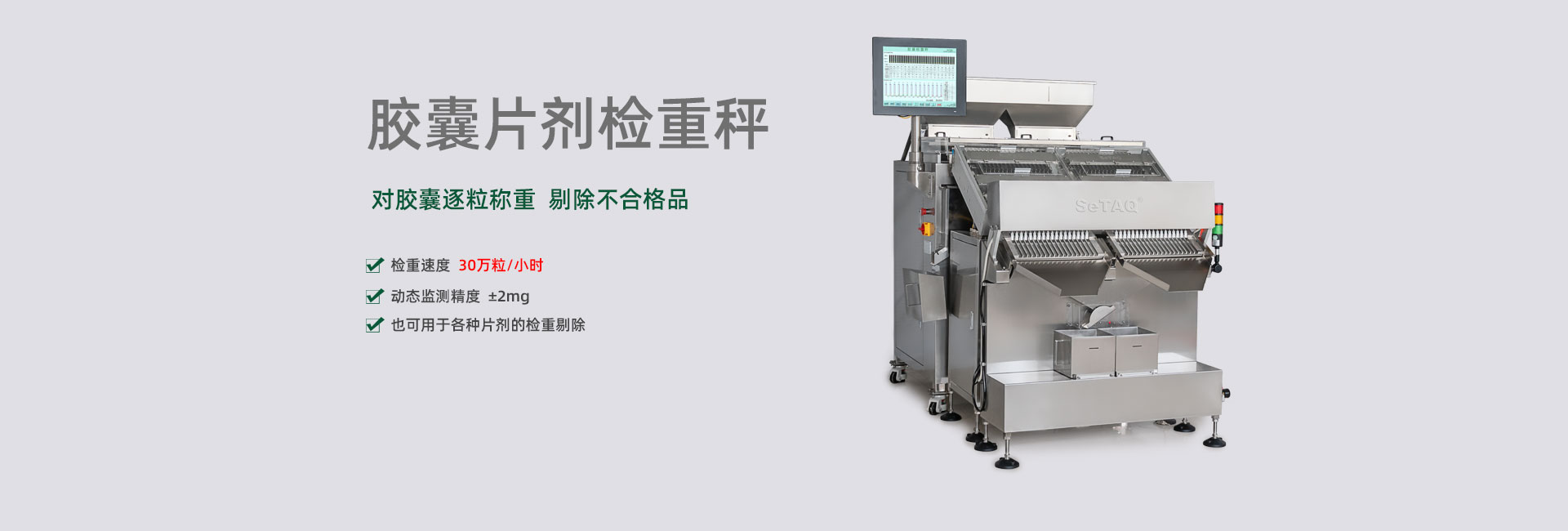 擁有近百項(xiàng)檢重專(zhuān)利和專(zhuān)有技術(shù),開(kāi)發(fā)的產(chǎn)品可高速、高精度地檢測(cè)膠囊、片劑、丸劑、軟袋、軟管、紙盒、藥瓶、紙箱、薄片及各種器械、零件的重量偏差或缺件